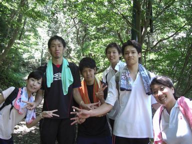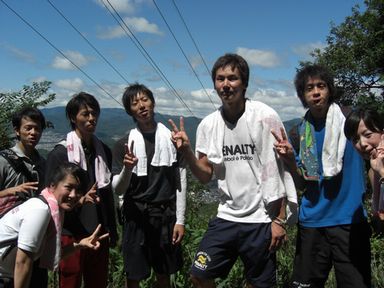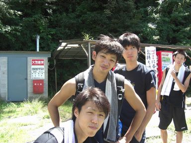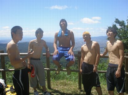![]() 左から川原君・奥平君・関君・筒井君・森田君です。 山登りで大量の汗をかいたため、ここでTシャツを着替えていました。 |
