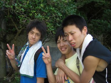 ![]() 左から西村君・渡邊君・関君です。関君は、今回トレーナーとしてこの登山を引っ張ってくれます。 |
