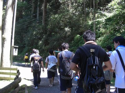 ![]() 延暦寺東塔に行かなければならないはずが、間違って西塔に向かってしまいました。来た道をみんなで引き返しています。 |