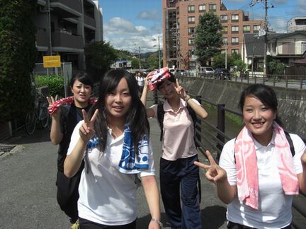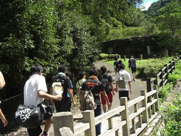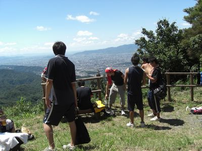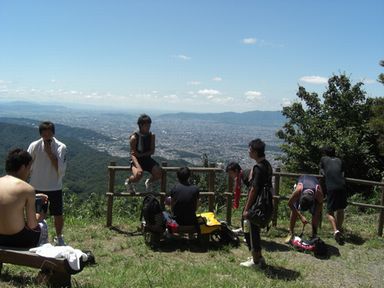 | 【出発!】 14日は、体育館を離れ、朝10時に修学院駅に集合しました。 遅刻する者もいなく、みなさん山登りを楽しみにしているようでした。 駅に着いたら、近くのスーパーでたくさんの飲料水を買い込んでおり、 これから始まる登山に向け、備えていました。 |